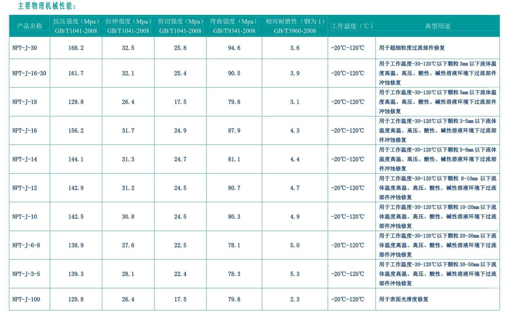 雙組分,以陶瓷、金屬碳化物、微型顆粒為骨材的耐磨復(fù)合材料,具有耐水、耐油、耐酸堿性。適用(-60℃-80℃)設(shè)備過流沖蝕、設(shè)備的大面積修復(fù)、設(shè)備預(yù)涂耐磨層,如旋流器、浮選柱、浮選機、泡沫槽、分級機、攪拌桶、溜槽、管件類、泵類等修復(fù)(典型用途見主要物理機械性能表)。